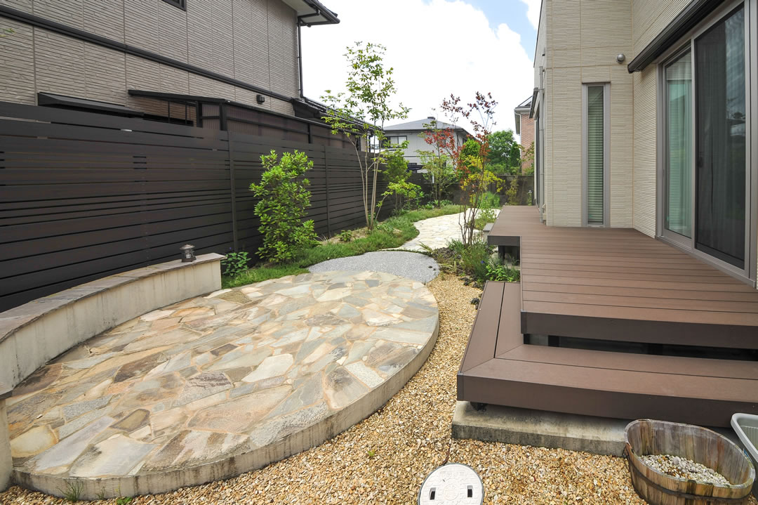 『家族団欒を楽しめる庭づくり』をテーマに、デザインから施工まで手がけました。 四季ごとに表情を変える植栽を楽しみながら、夏には家族みんなで花火をしたり。そんな時間を育む庭です。 開放感のあるウッドデッキやタイルテラスが、心地よい空間を造りました。