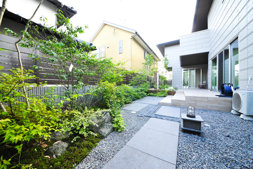 「静寂」「癒し」をテーマにしています。広々としたタイルテラスを中心に、植栽で賑やかさを加えました。四季の移ろい感じたり、休日の午後をゆっくり過ごす為の空間をイメージし、デザイン・施工しました。